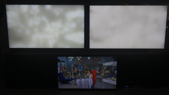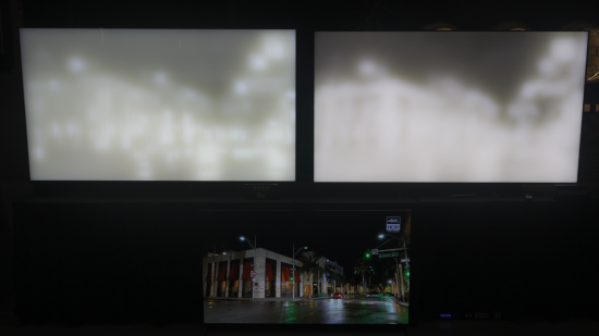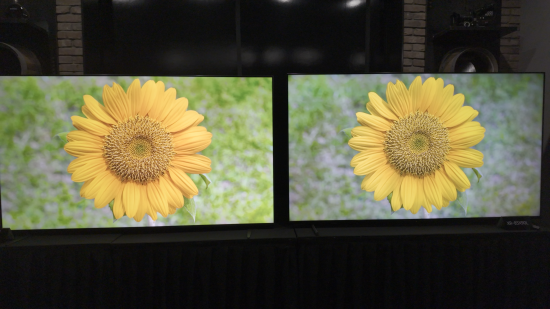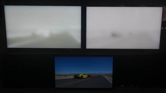 索尼现场为我们展示了新品9系和一台竞品Mini LED旗舰电视的对比,为了更直观地看到各自的背光灰阶控制精度,两台电视的偏光膜都被取下了。可以看到,左侧的9系的背光控制明显比右侧的竞品更加精细,背景、赛车、柏油路甚至路面标志线都有相应的背光灰度处理,右侧的画面就显得很“平”,前景的路面和背景混为了一体,只有在车子的阴影部分做了较为明显的背光处理。