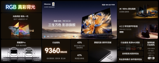 而海信1月初上市的RGB-Mini LED电视E8S,万元级就能买到下一代显示技术,堪称“同价代际差”:它不仅有RGB-Mini LED的所有优势,还是影游全能的六边形战士——看赛事有影院级质感,玩游戏有原生高刷无拖影,日常使用也智能便捷,适配全家需求。